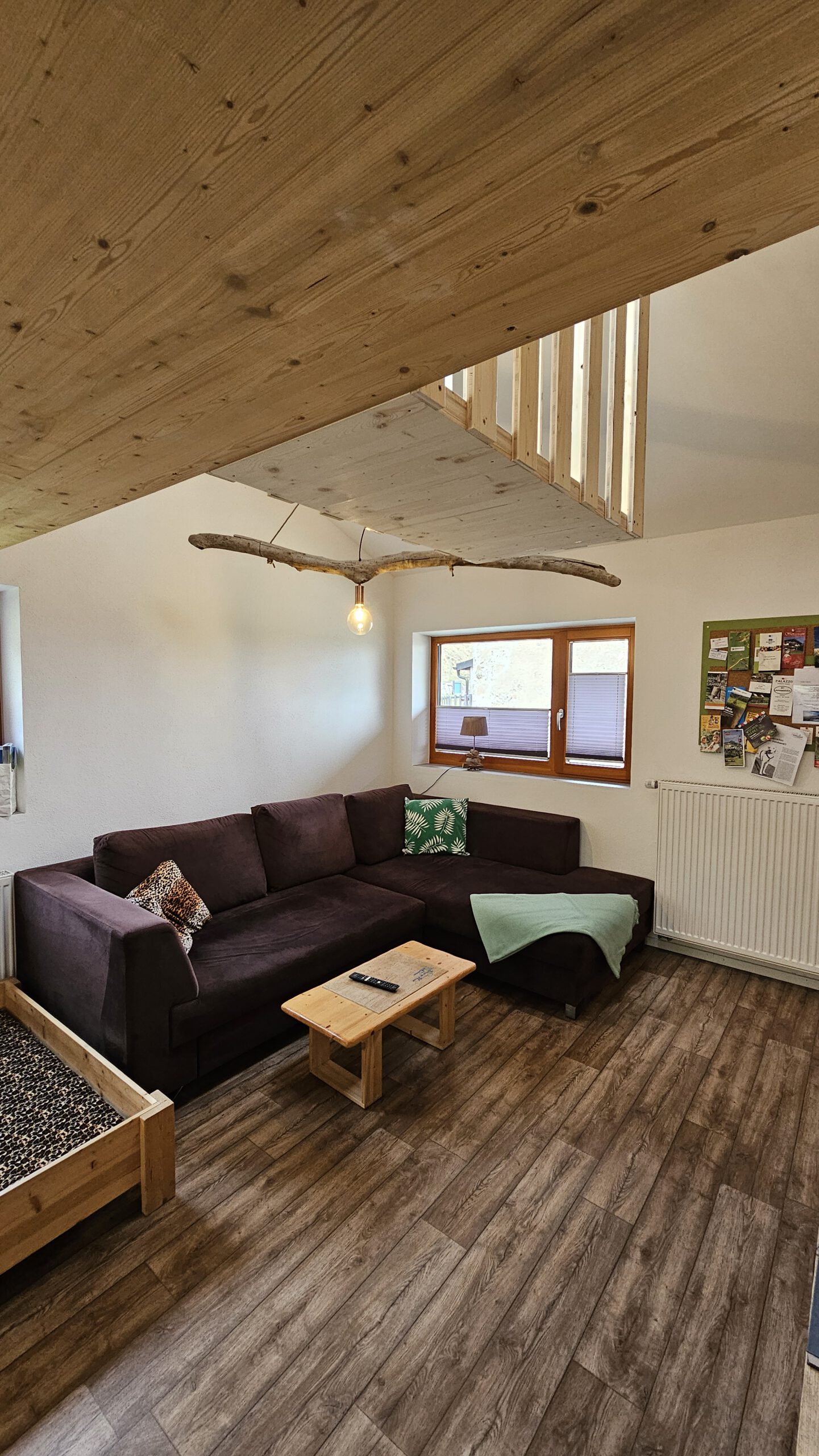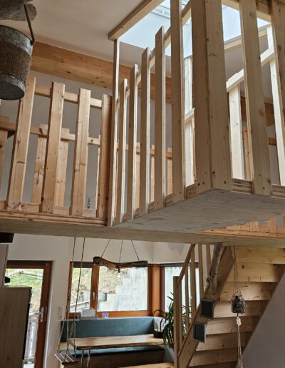 Das Schlafzimmer der Naturwohnung ist ein gemütlicher Rückzugsort und verfügt über ein großes Doppelbett (180×200), ein gemütliches Hundebett und einen geräumigen Schrank, um persönliche Gegenstände ordentlich zu verstauen. Die kleine Baumhausgalerie mit weiteren zwei Schlafmöglichkeiten ist das Herzstück dieser Wohnung und bietet einen einzigartigen Ort zum Ausruhen und Entspannen.